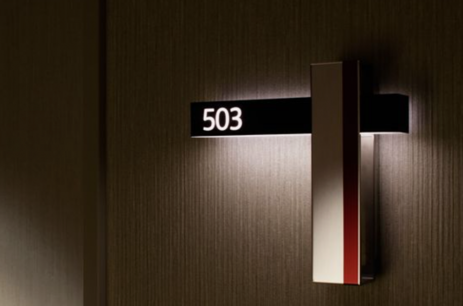 酒店門牌號標(biāo)識設(shè)計的創(chuàng)意,房號與門牌號的結(jié)合點,這個是一個很貼切的設(shè)計手法,還可以把門禁系統(tǒng)結(jié)合到當(dāng)中去,這是我們最重要的一個環(huán)節(jié)。